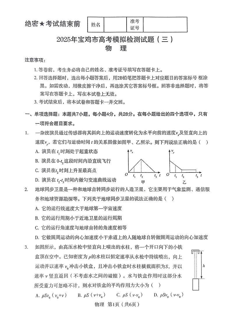 陕西省宝鸡市2025届高考模拟检测试题(三)物理.pdf