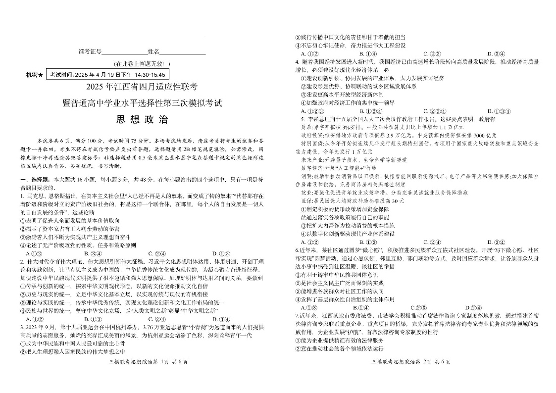 2025年江西省高三四月适应性联考(三模)政治.pdf