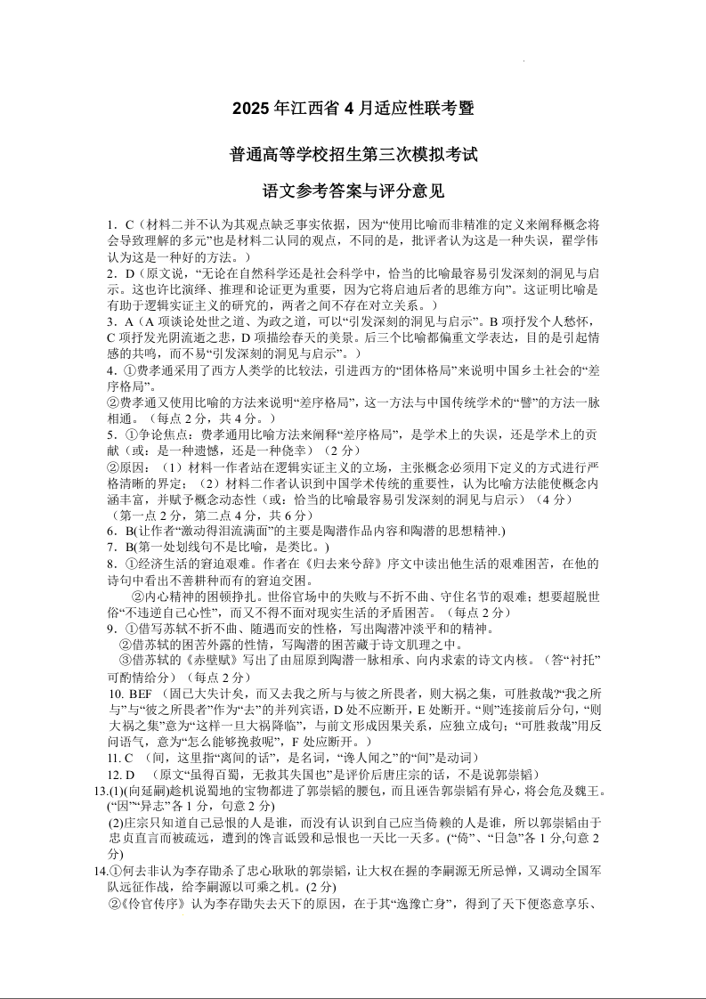 2025年江西省高三四月适应性联考(三模)语文答案.docx