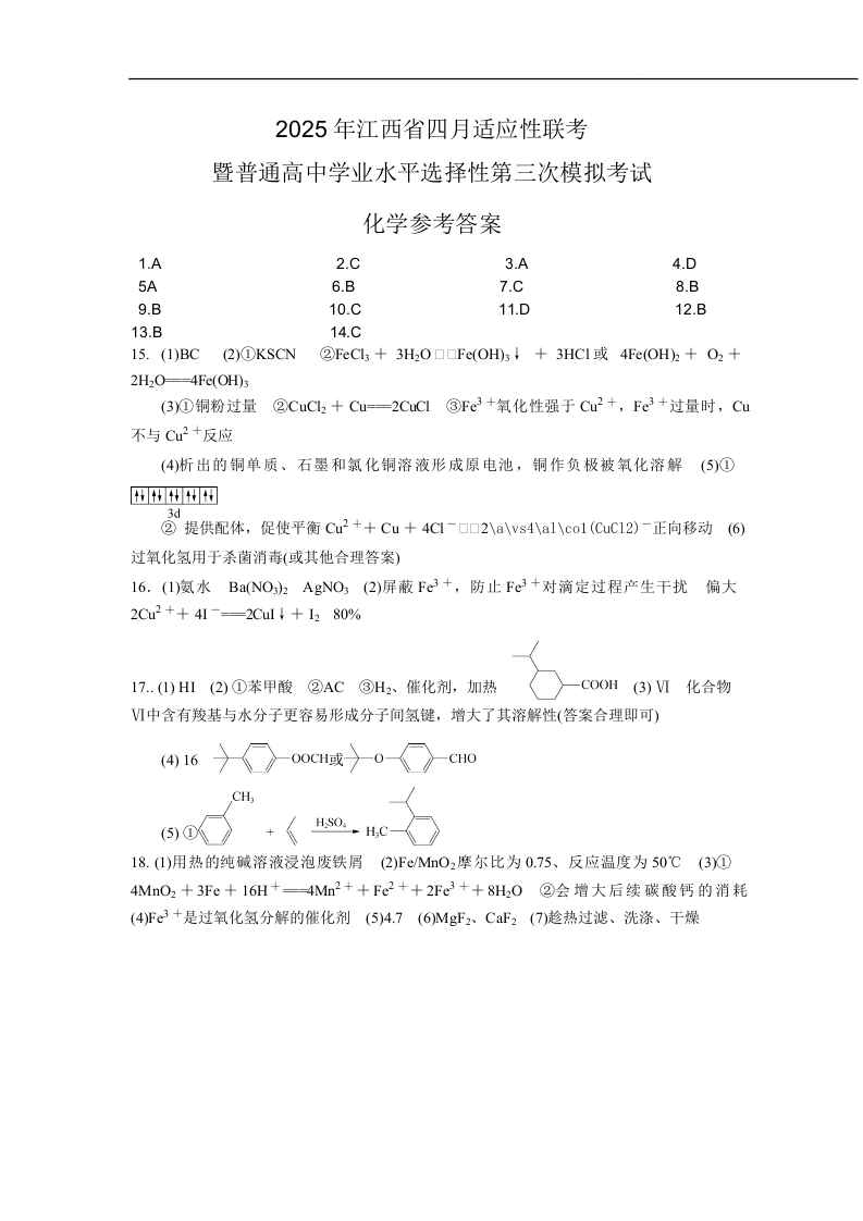 2025年江西省高三四月适应性联考(三模)化学答案.docx