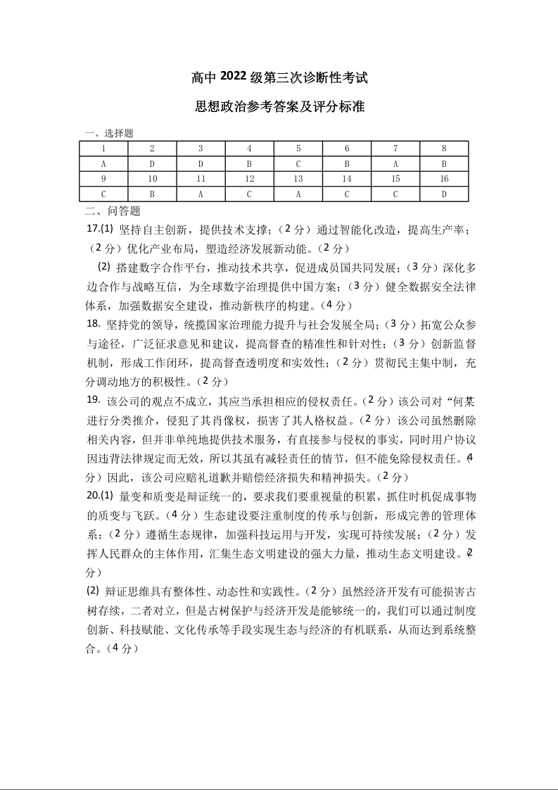 四川省元三维大联考·高2022级第三次诊断性测试 政治答案.docx