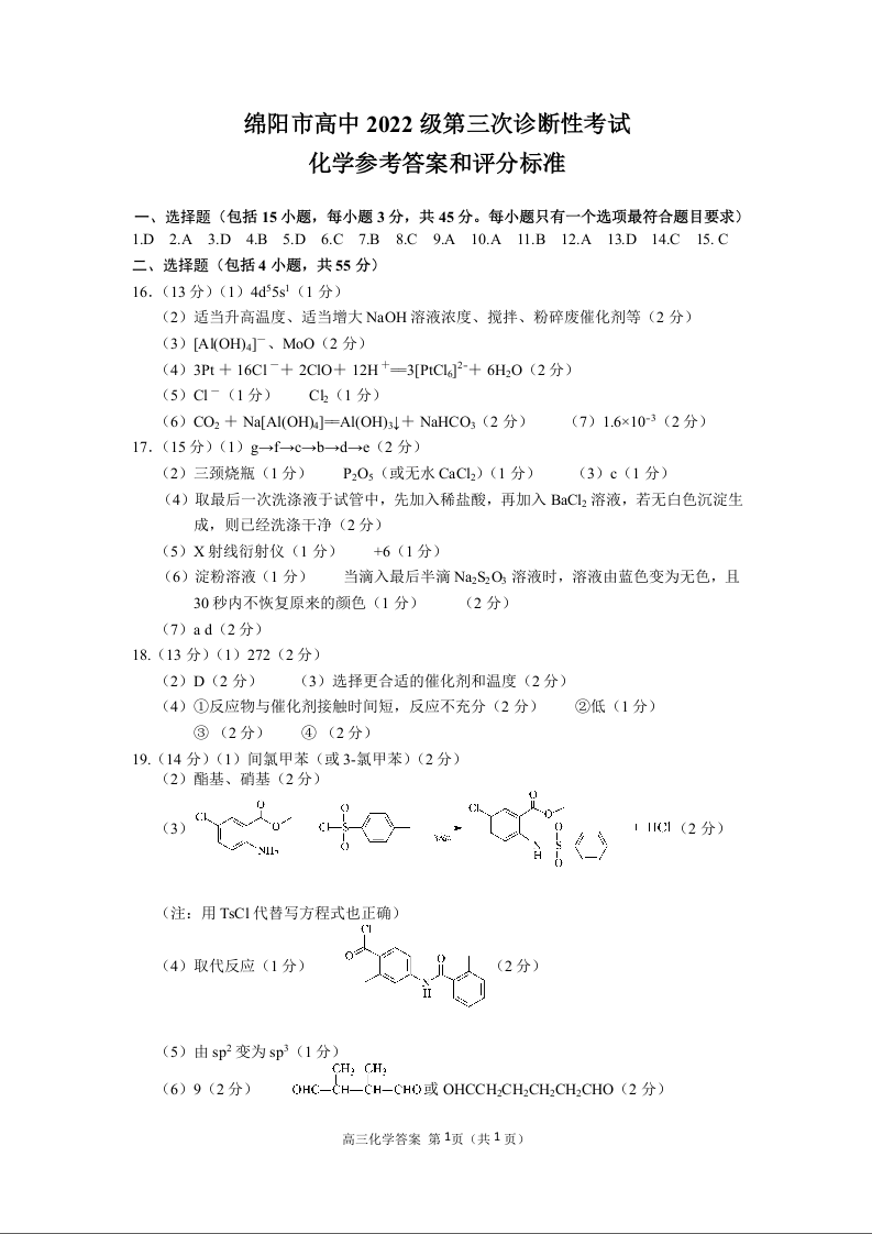 四川省元三维大联考·高2022级第三次诊断性测试 化学答案.docx