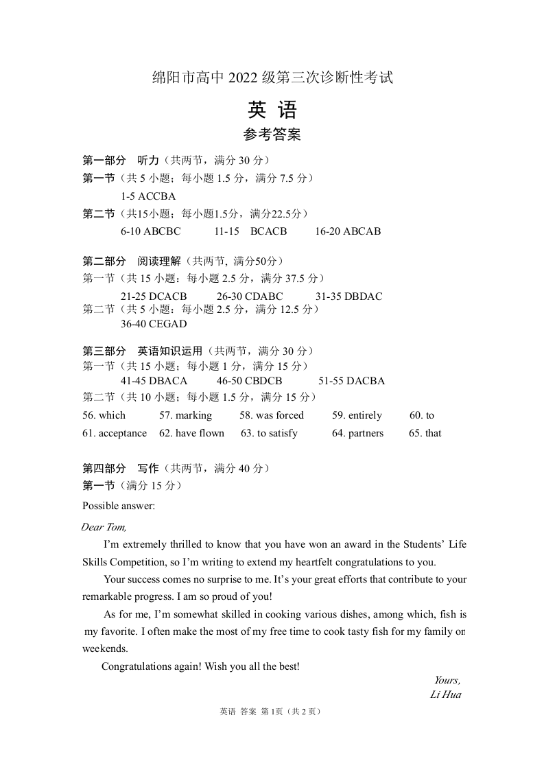 四川省绵阳市高中2022级第三次诊断性考试 英语答案.docx