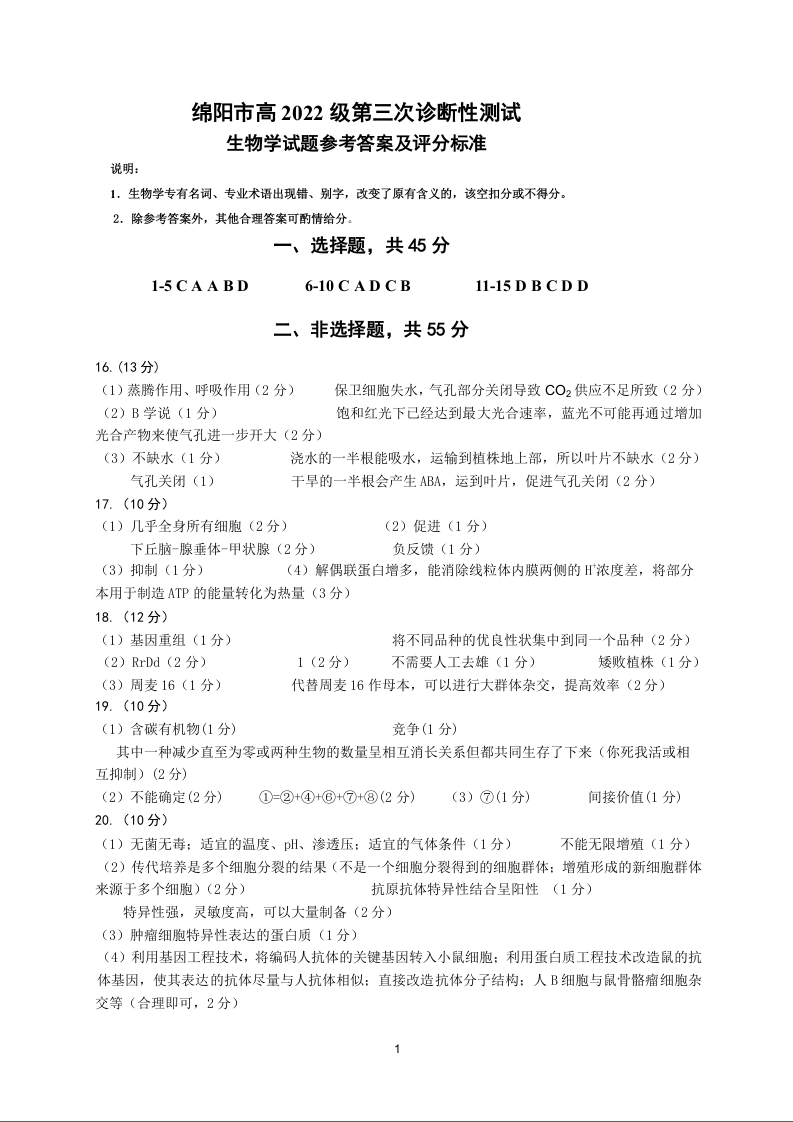 四川省绵阳市高中2022级第三次诊断性考试 生物答案.docx