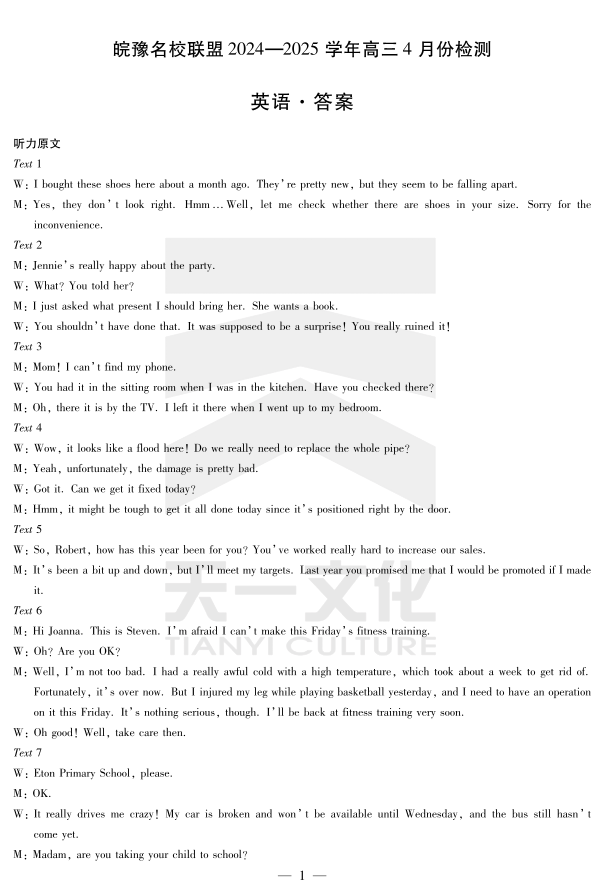 皖豫名校联盟2024-2025学年高三4月份检测 英语答案.pdf