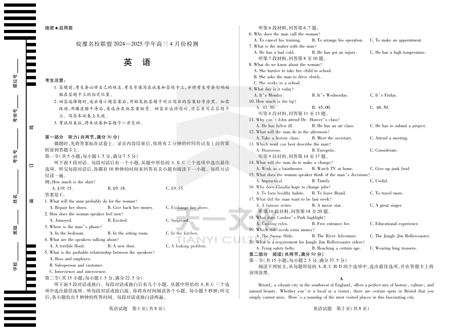 皖豫名校联盟2024-2025学年高三4月份检测 英语.pdf