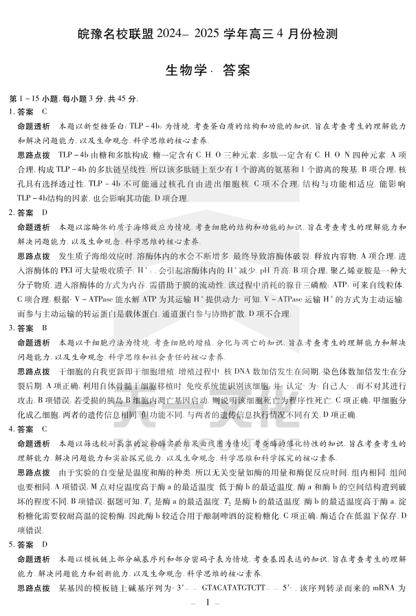 皖豫名校联盟2024-2025学年高三4月份检测 生物答案.pdf