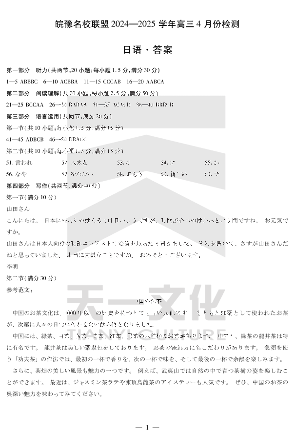 皖豫名校联盟2024-2025学年高三4月份检测 日语答案.pdf