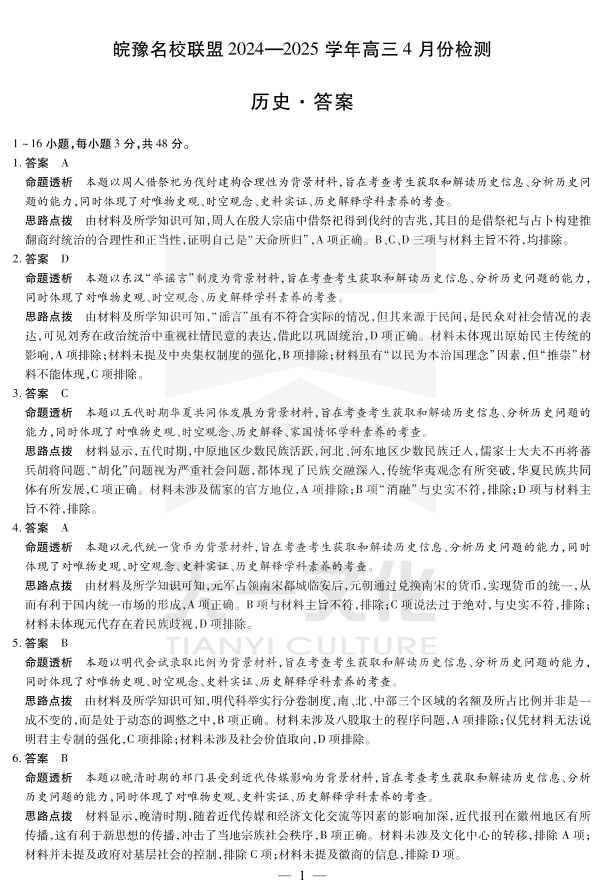 皖豫名校联盟2024-2025学年高三4月份检测 历史答案.pdf
