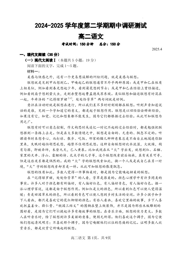 江苏扬州市邗江区2024-2025学年高二下学期期中考试 语文(含答案).pdf