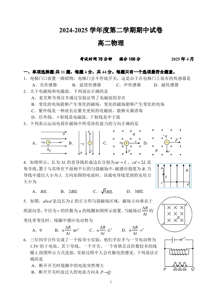 江苏扬州市邗江区2024-2025学年高二下学期期中考试 物理(含答案).pdf
