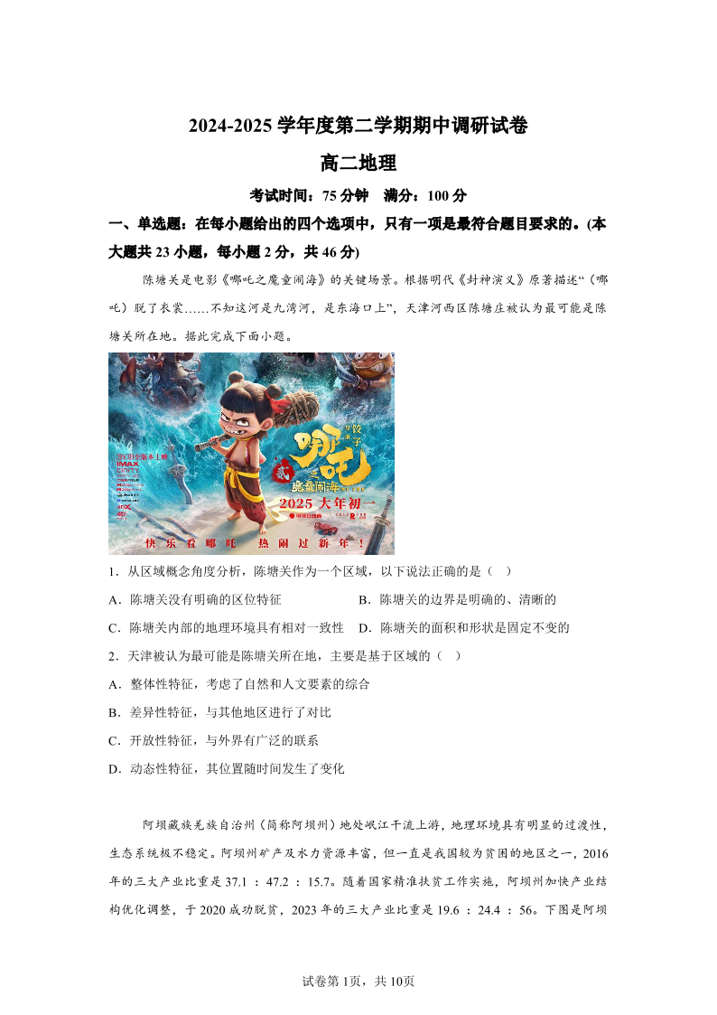江苏扬州市邗江区2024-2025学年高二下学期期中考试 地理(含答案).pdf