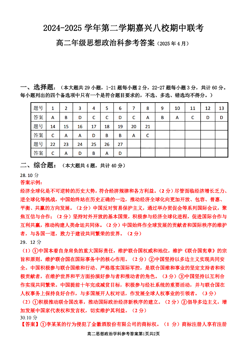 嘉兴八校联盟2024学年高二第二学期期中联考 政治答案.pdf