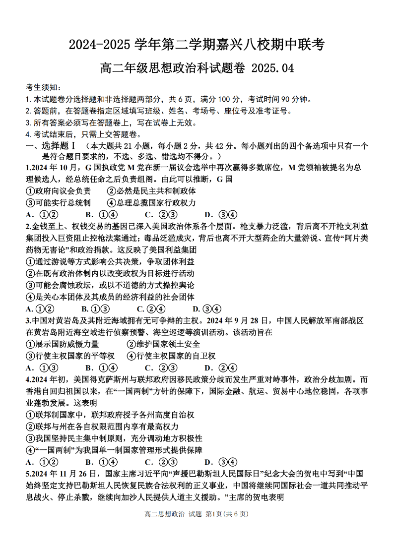 嘉兴八校联盟2024学年高二第二学期期中联考 政治.pdf