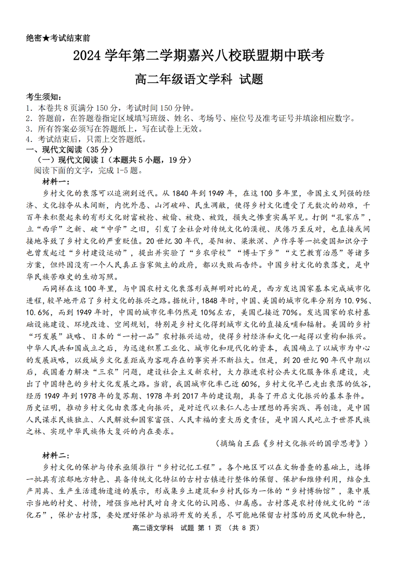 嘉兴八校联盟2024学年高二第二学期期中联考 语文.pdf