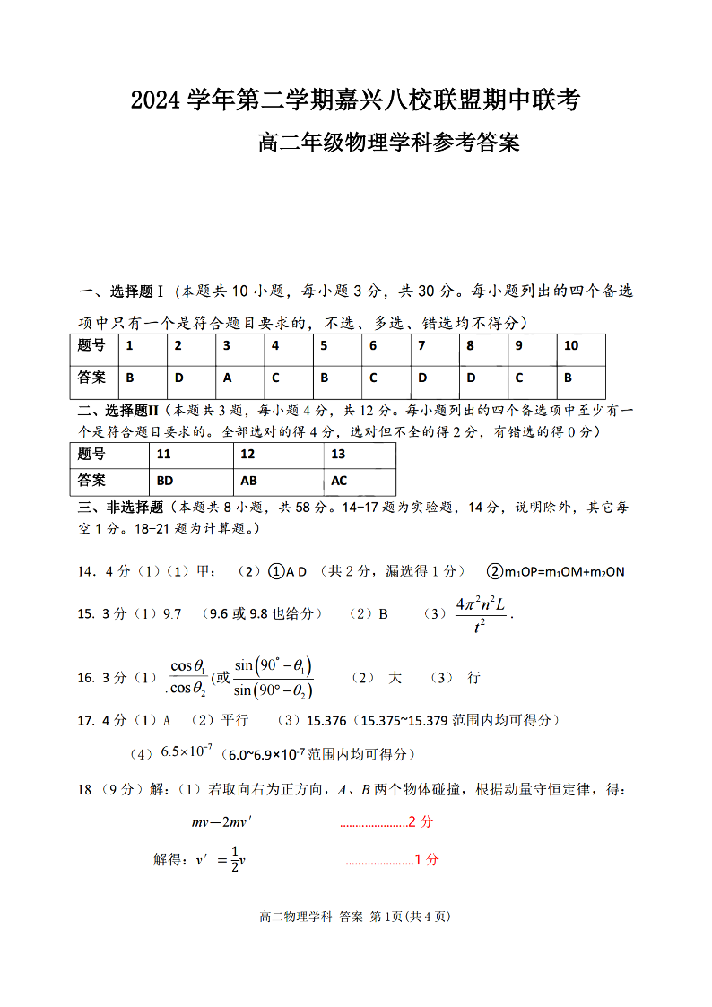 嘉兴八校联盟2024学年高二第二学期期中联考 物理答案.pdf