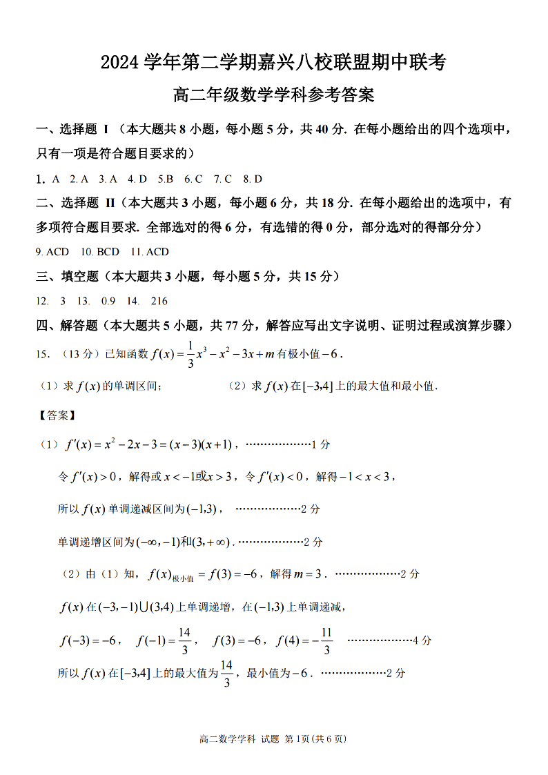嘉兴八校联盟2024学年高二第二学期期中联考 数学答案.pdf
