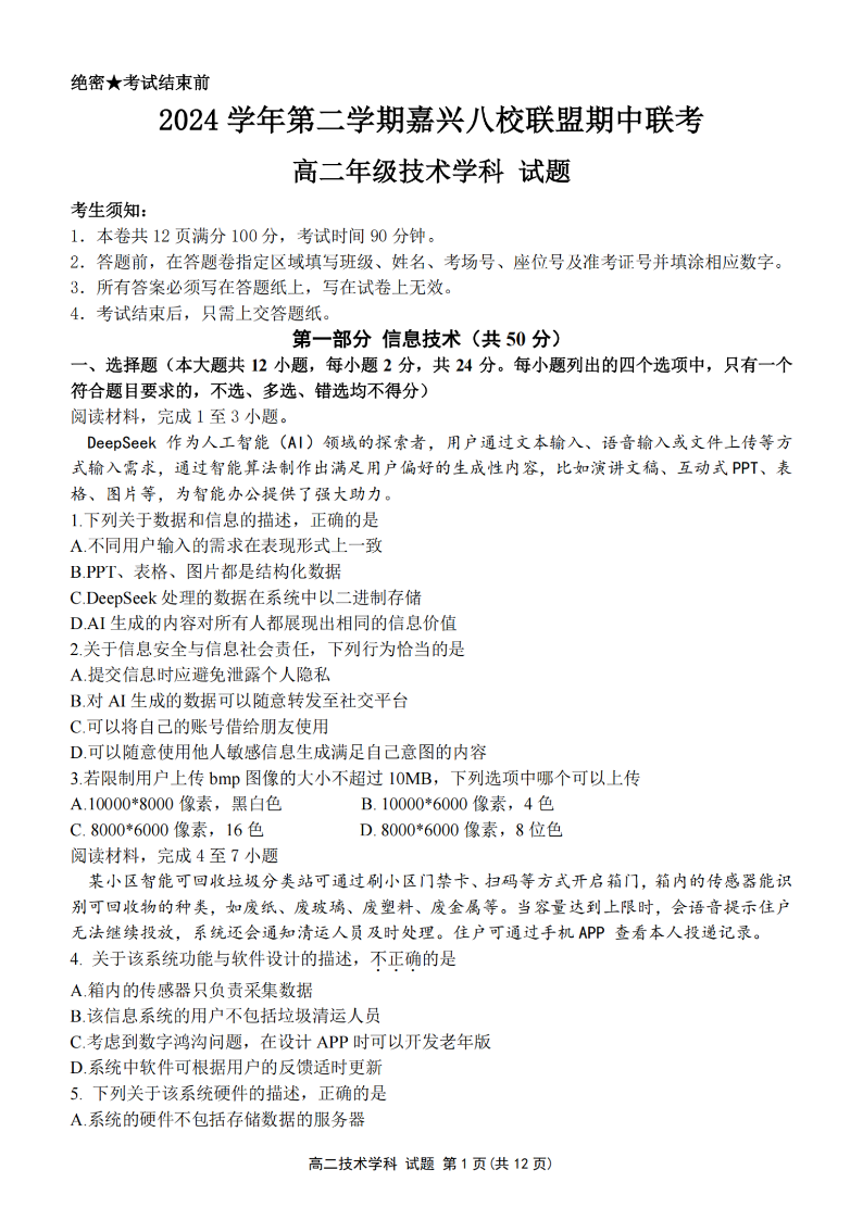 嘉兴八校联盟2024学年高二第二学期期中联考 技术.pdf
