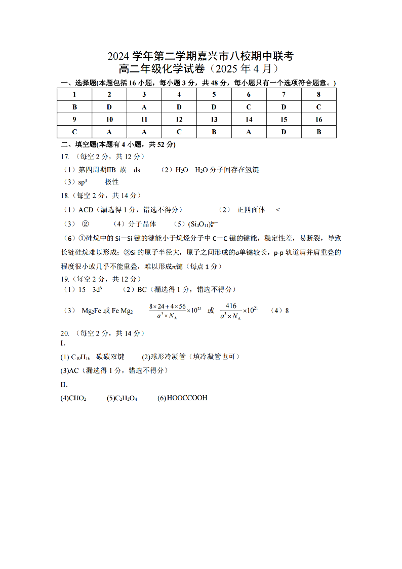 嘉兴八校联盟2024学年高二第二学期期中联考 化学答案.pdf