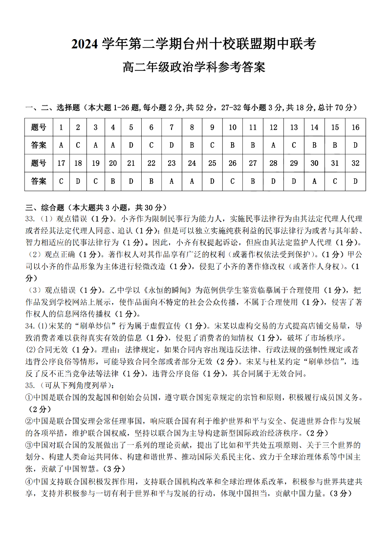 台州十校联盟2024学年高二第二学期期中联考 政治答案.pdf
