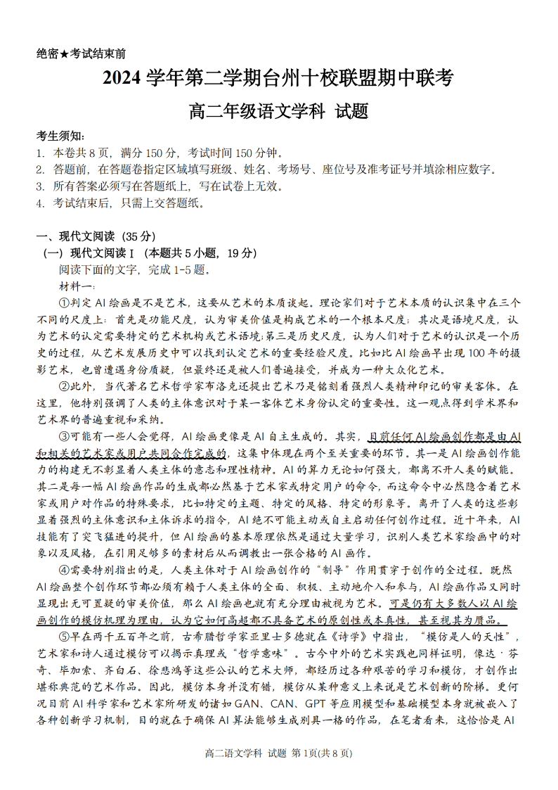 台州十校联盟2024学年高二第二学期期中联考 语文.pdf