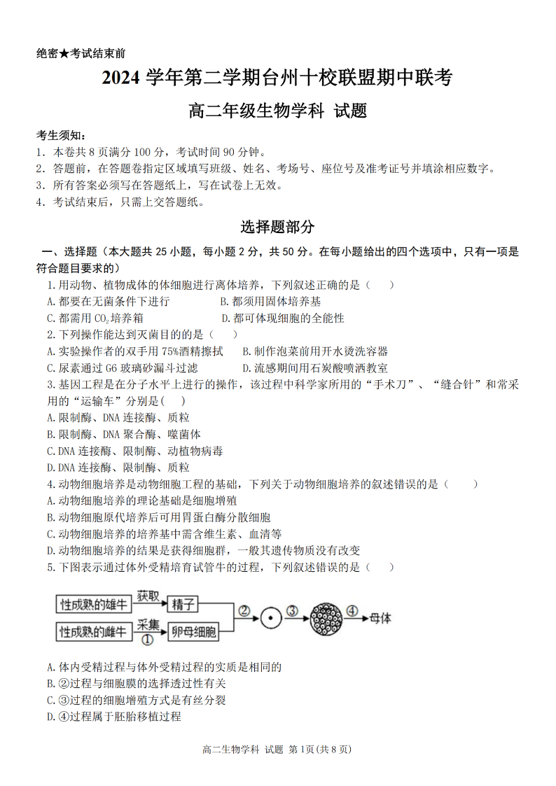 台州十校联盟2024学年高二第二学期期中联考 生物.pdf