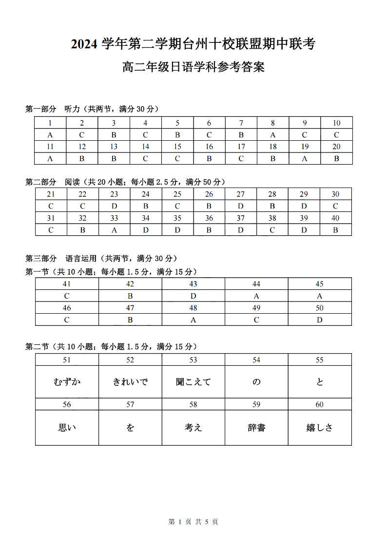 台州十校联盟2024学年高二第二学期期中联考 日语答案.pdf