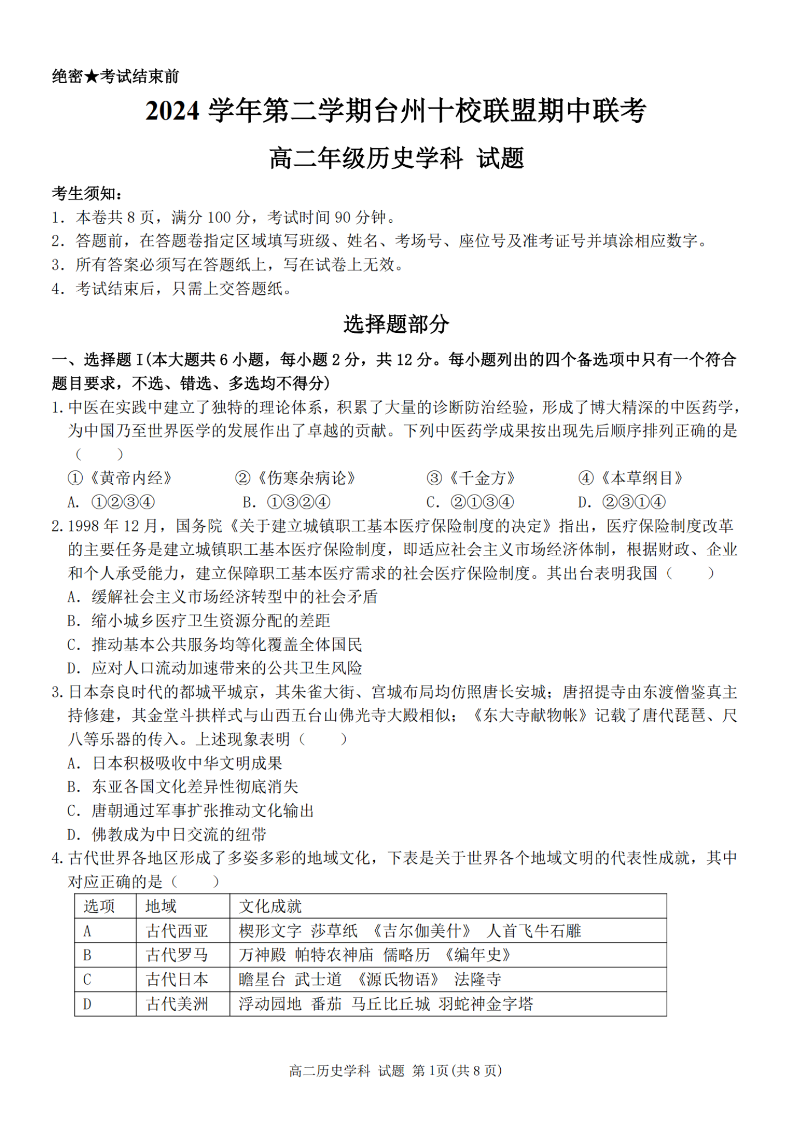 台州十校联盟2024学年高二第二学期期中联考 历史.pdf