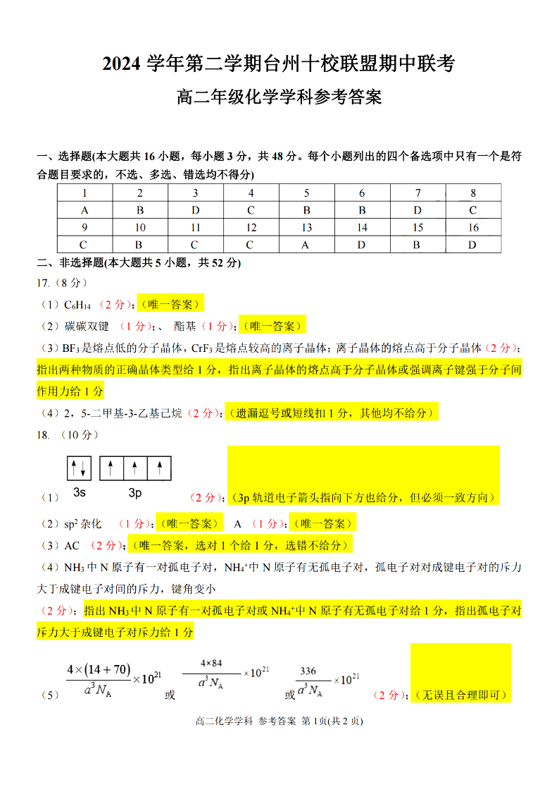 台州十校联盟2024学年高二第二学期期中联考 化学答案.pdf