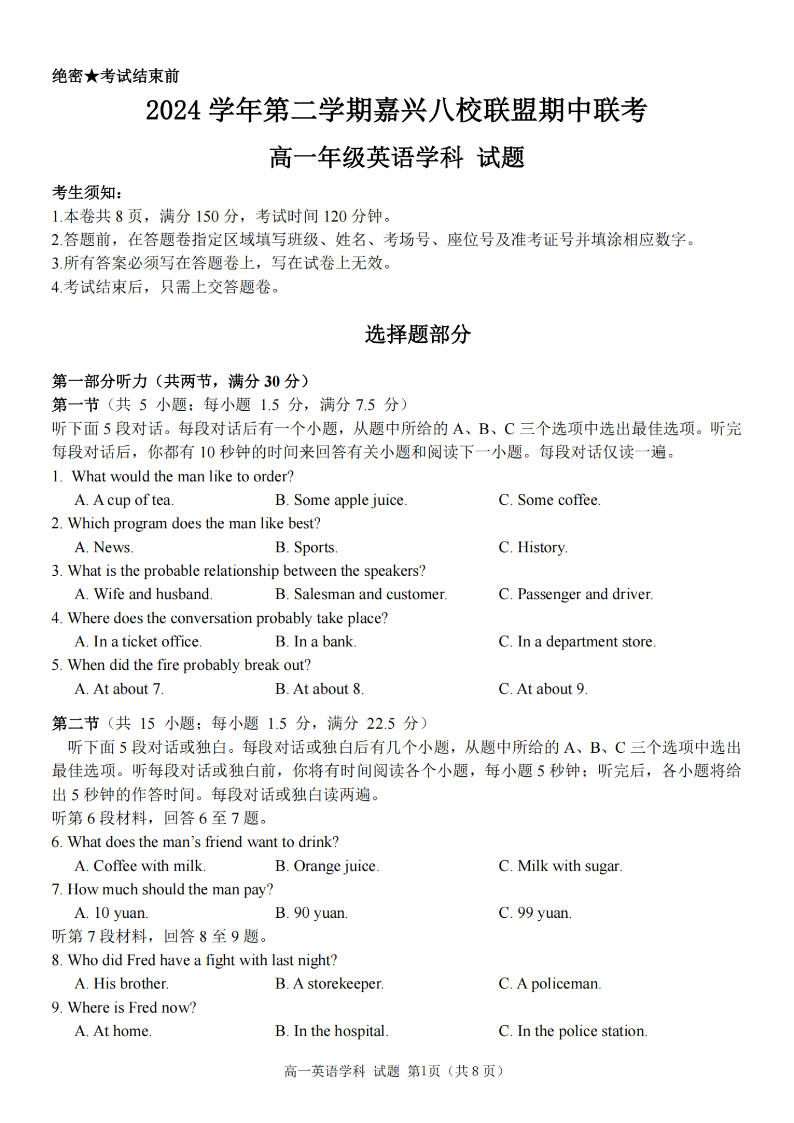 嘉兴八校联盟2024学年高一第二学期期中联考 英语.pdf