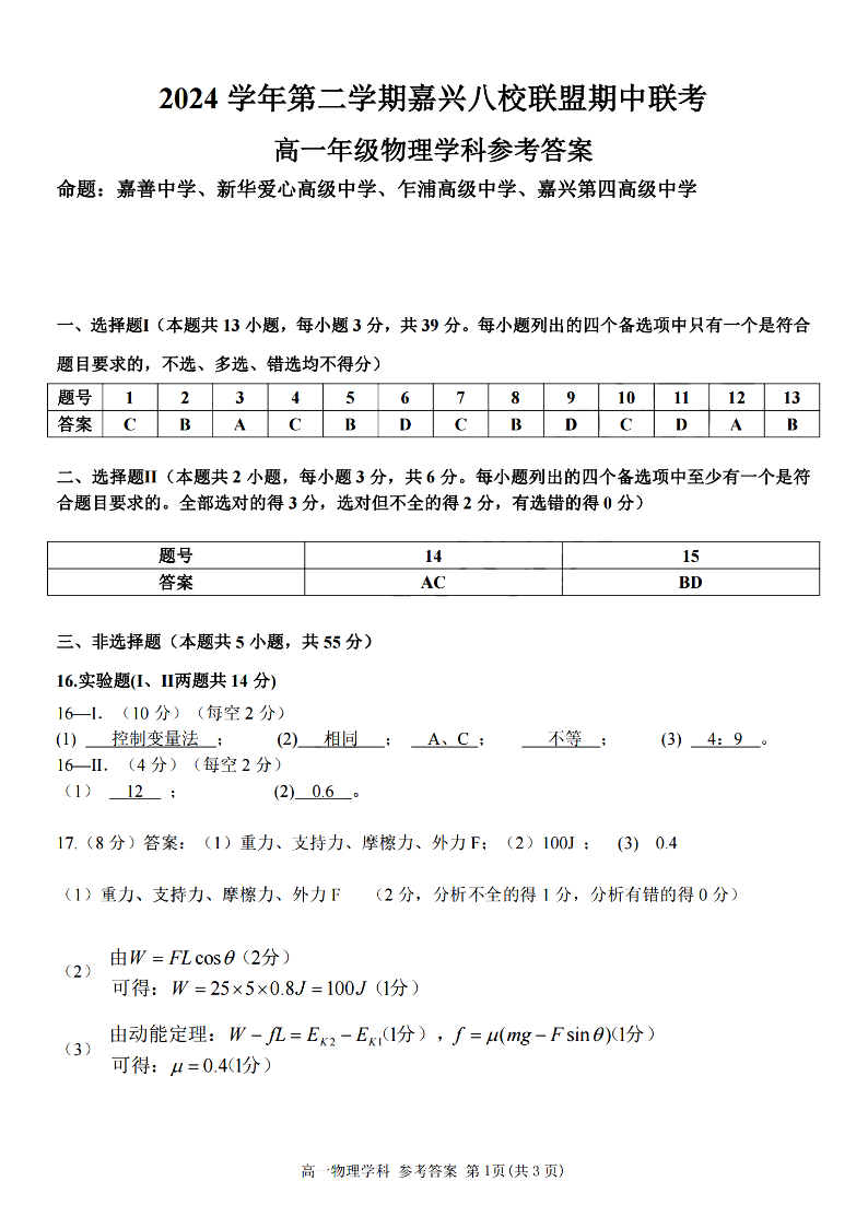嘉兴八校联盟2024学年高一第二学期期中联考 物理答案.pdf