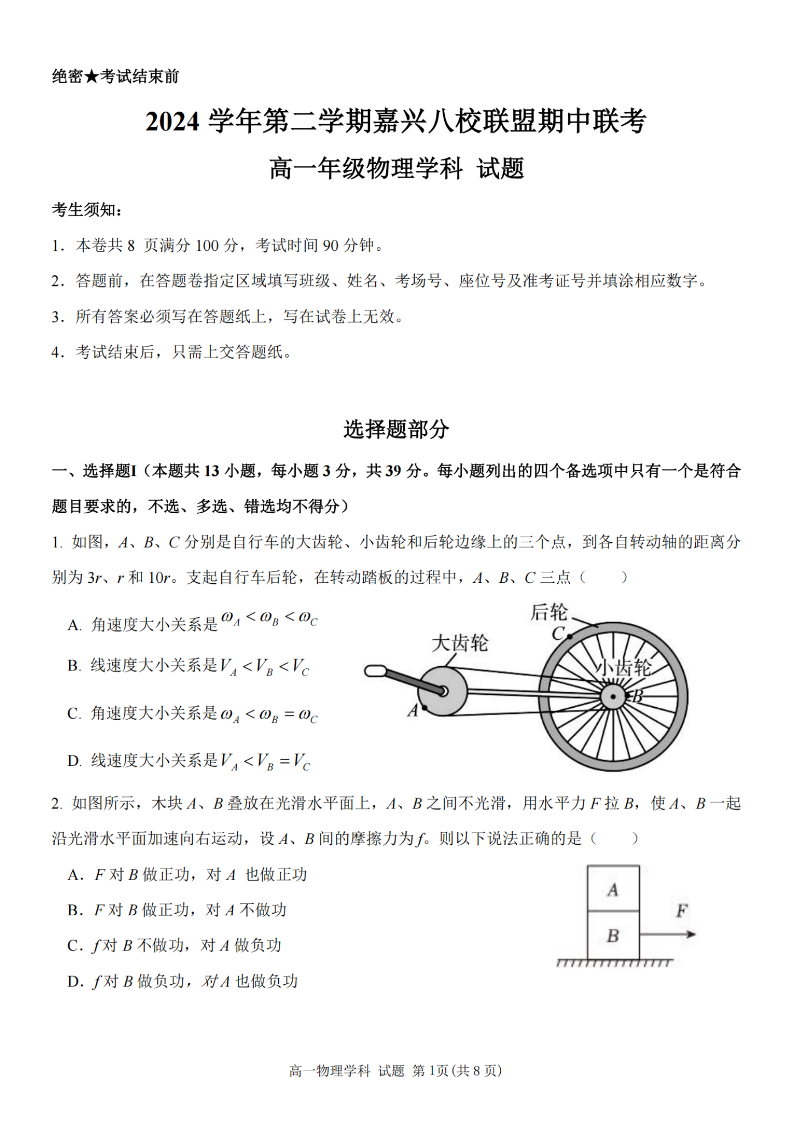 嘉兴八校联盟2024学年高一第二学期期中联考 物理.pdf