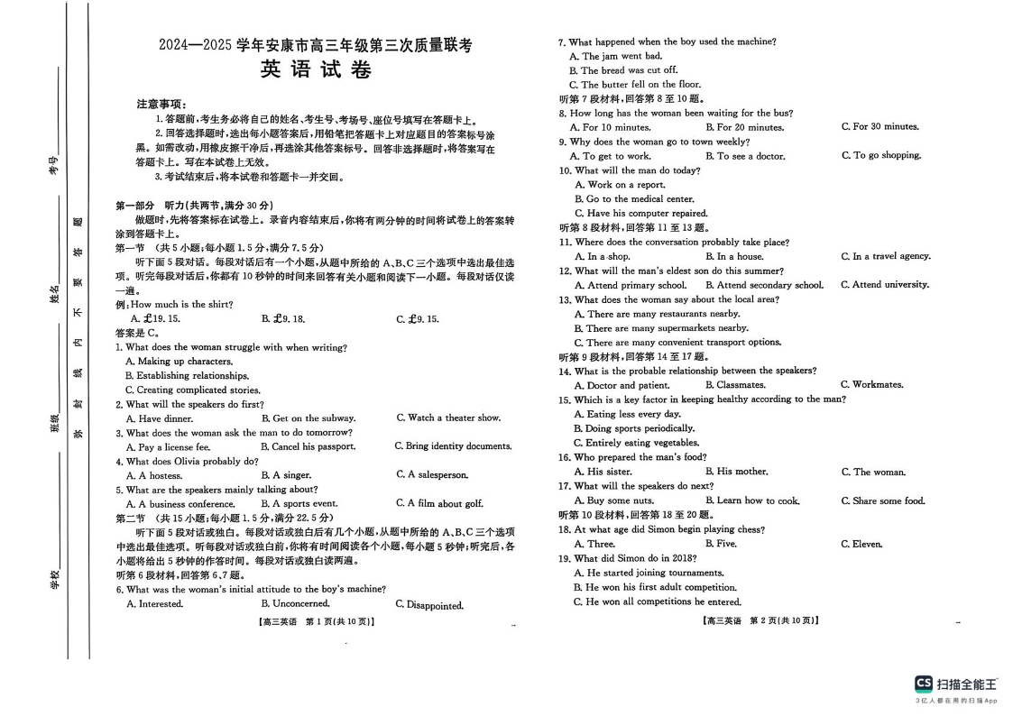 陕西省安康市2024-2025学年高三下学期第三次质量联考 英语.pdf