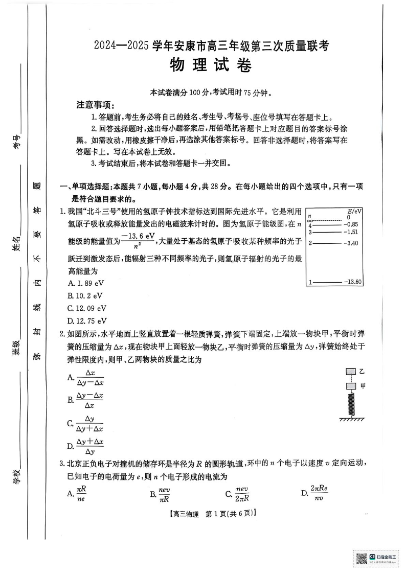 陕西省安康市2024-2025学年高三下学期第三次质量联考 物理.pdf