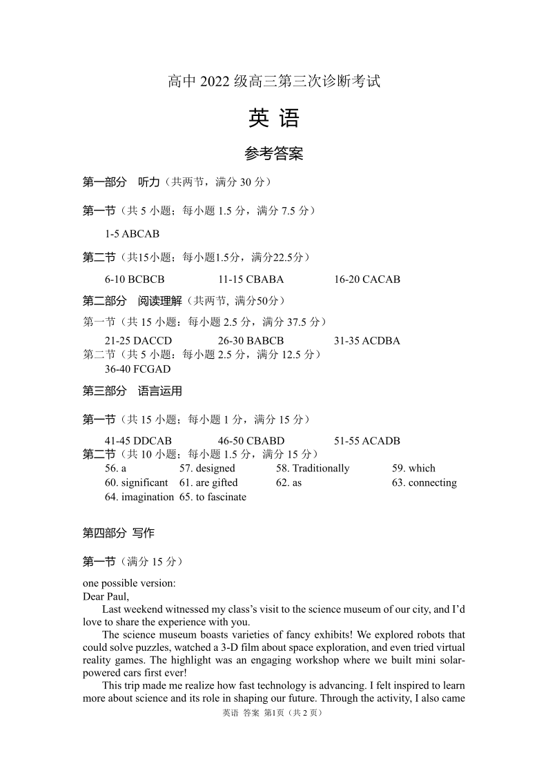 四川省遂宁市高2022级第三次诊断性测试 英语答案.pdf