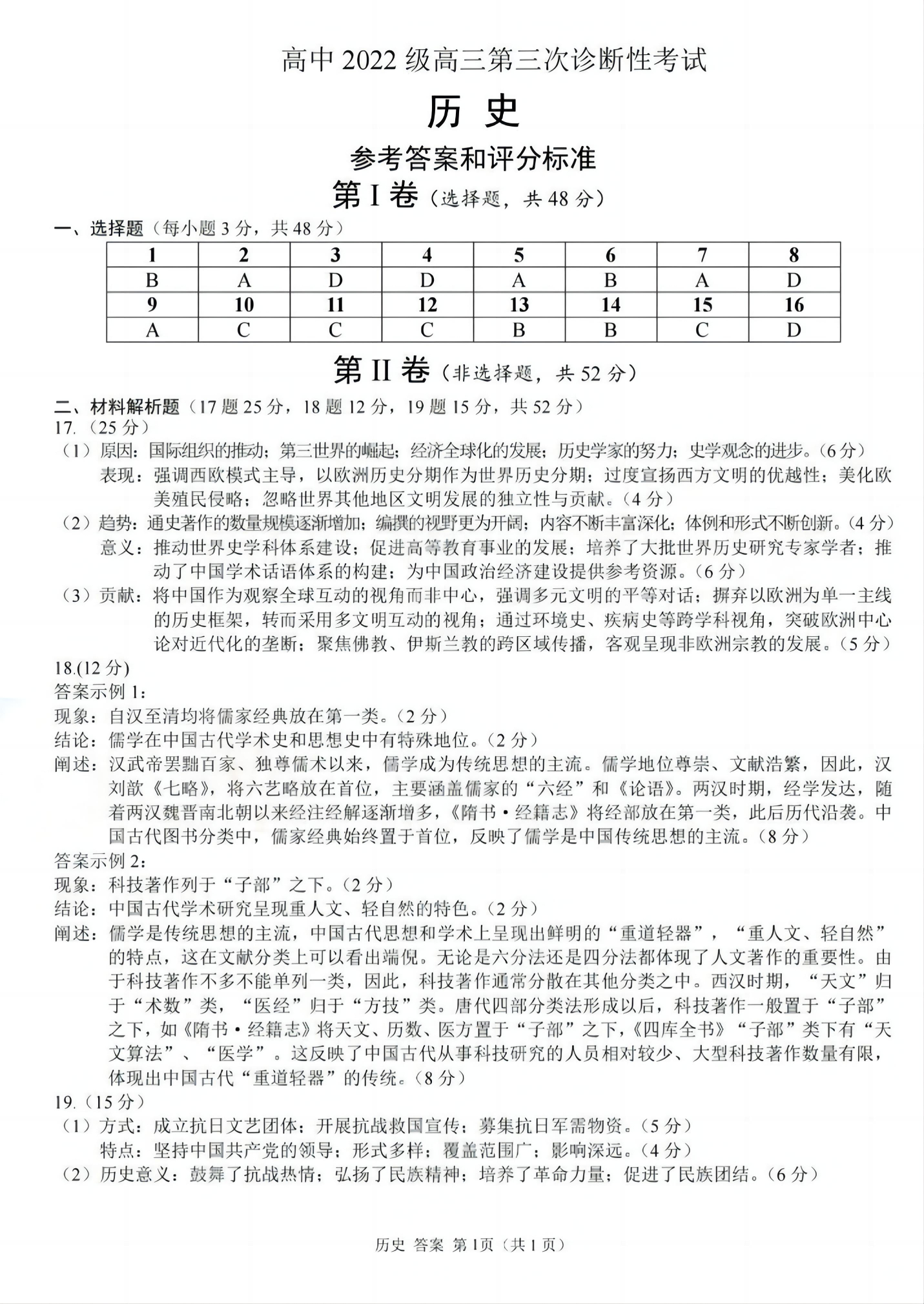 四川省遂宁市高2022级第三次诊断性测试 历史答案.pdf