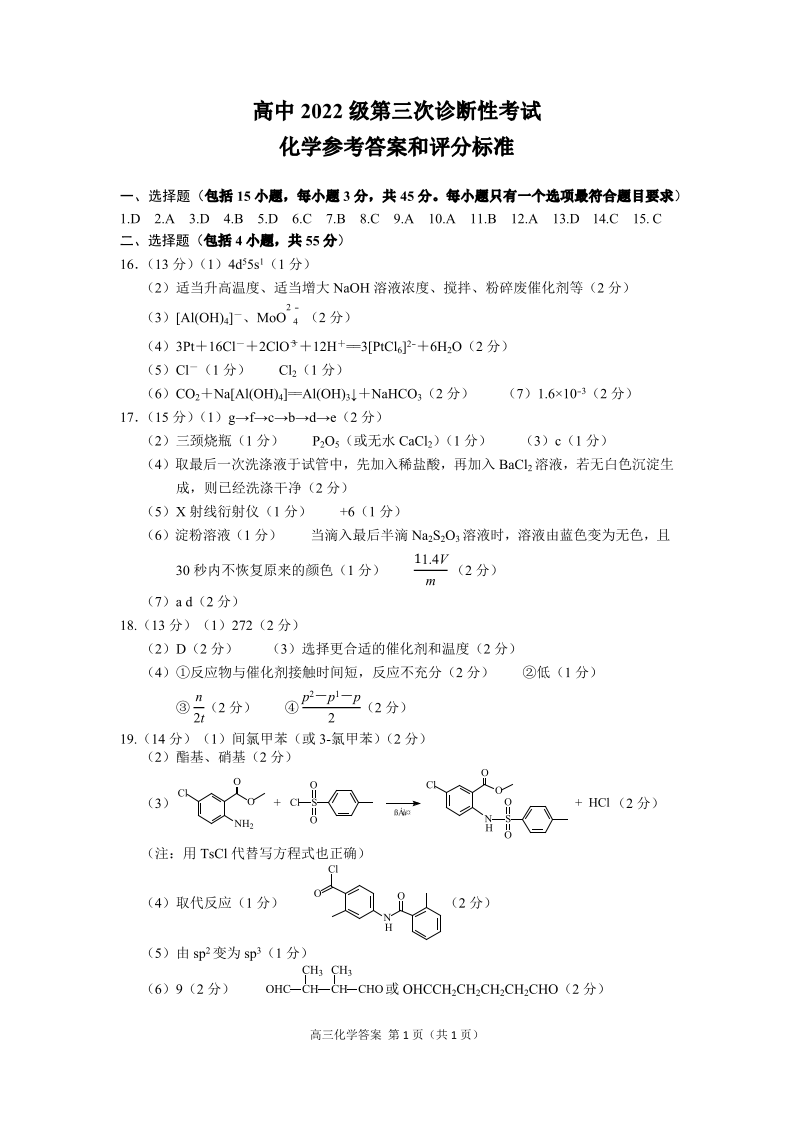 四川省遂宁市高2022级第三次诊断性测试 化学答案.pdf