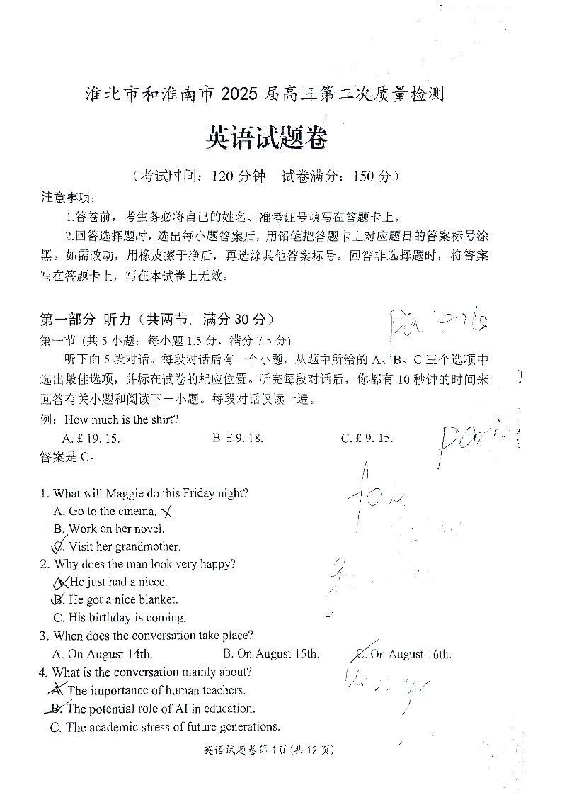 安徽省淮北市和淮南市2025届高三第二次质量检测 英语.pdf