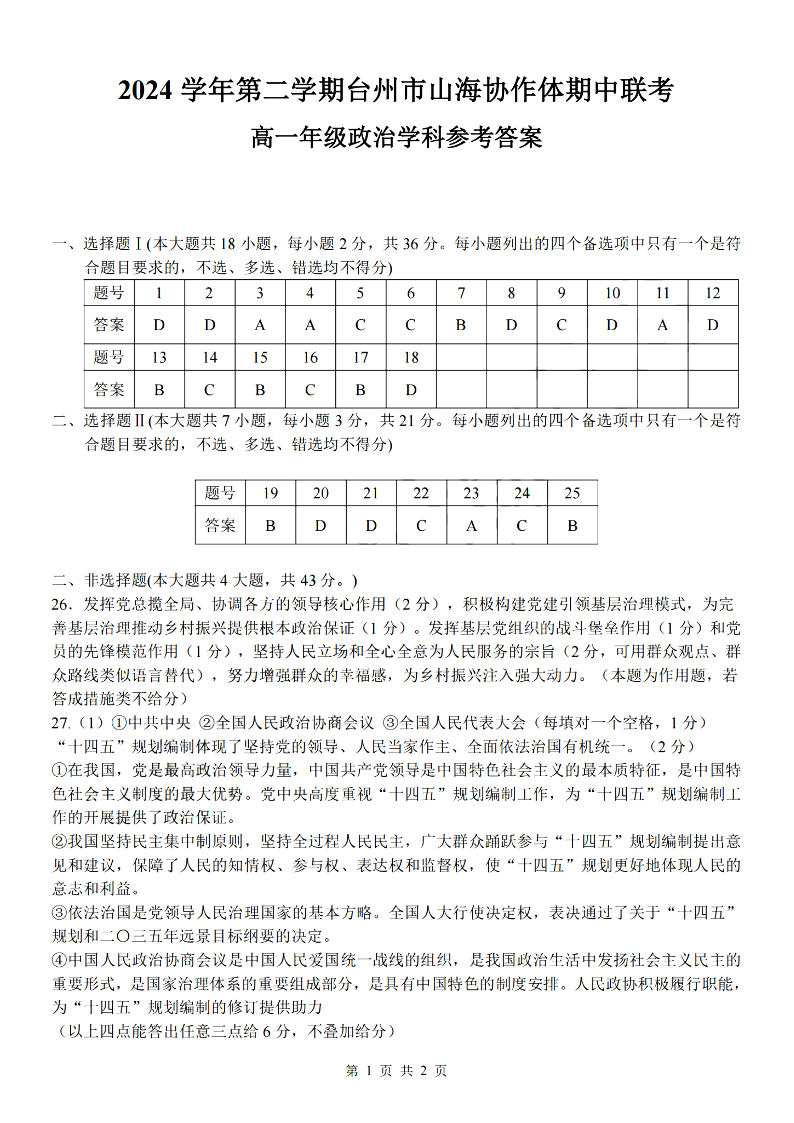 台州市山海协作体2024学年高一第二学期期中联考 政治答案.pdf