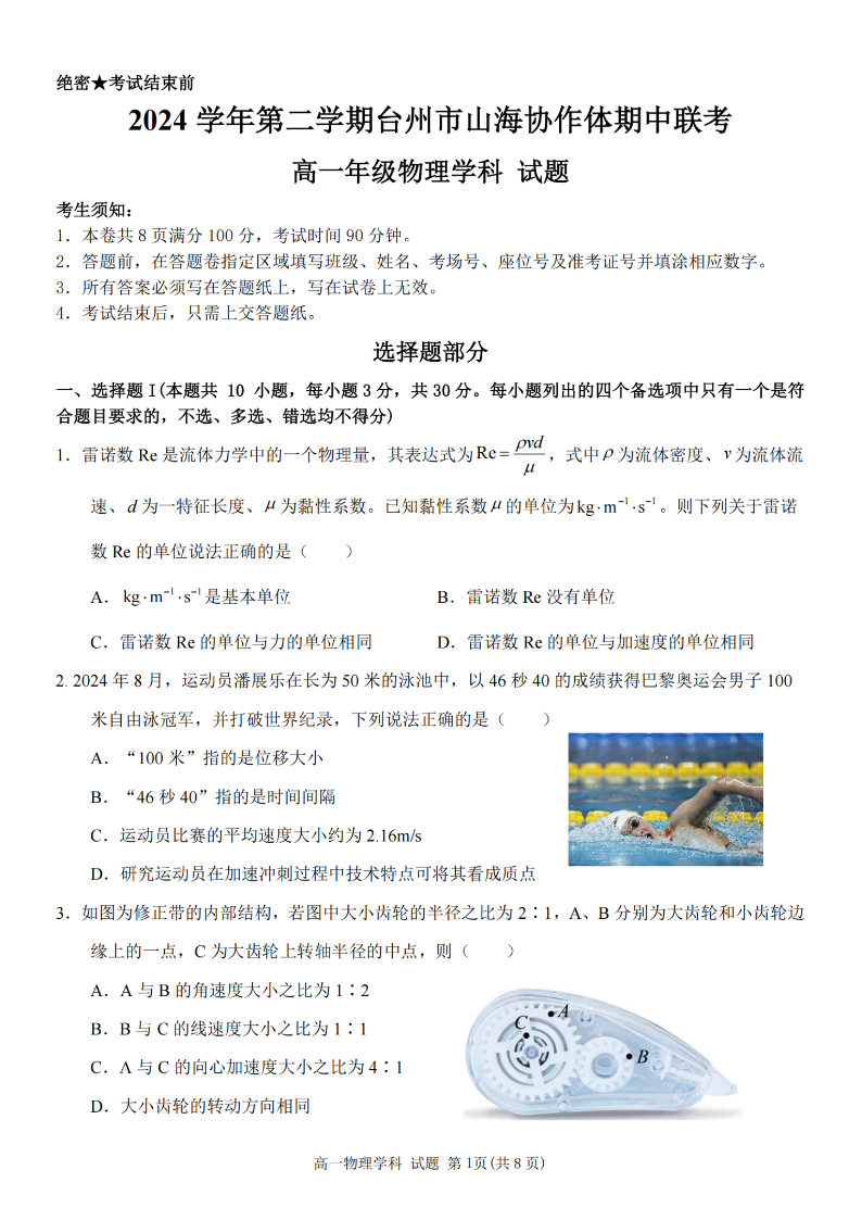 台州市山海协作体2024学年高一第二学期期中联考 物理.pdf