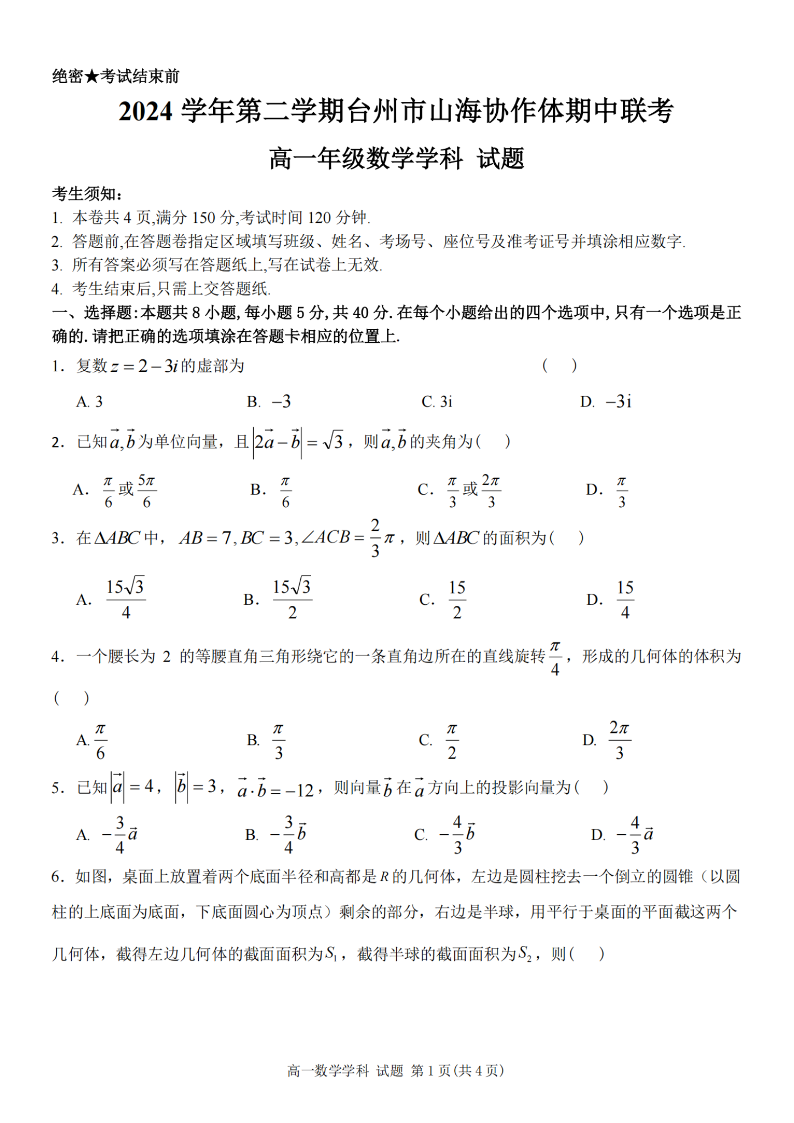 台州市山海协作体2024学年高一第二学期期中联考 数学.pdf