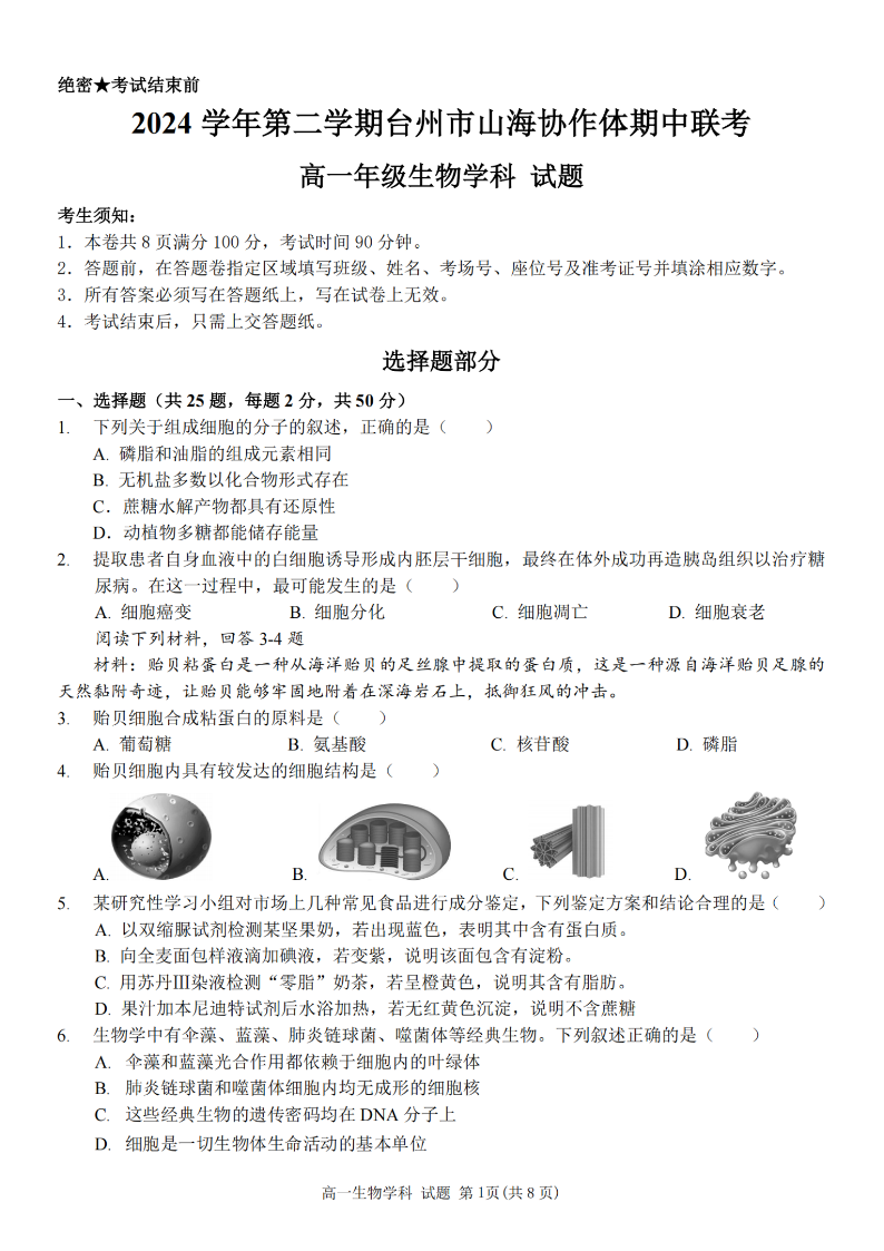 台州市山海协作体2024学年高一第二学期期中联考 生物.pdf