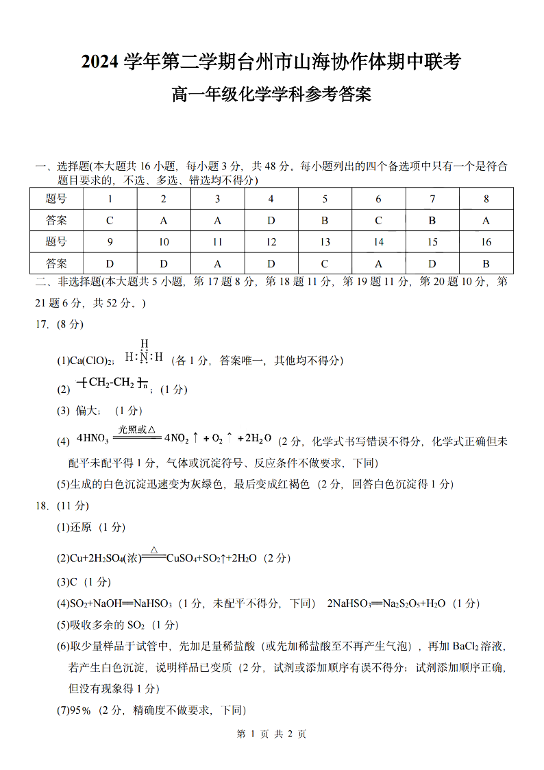 台州市山海协作体2024学年高一第二学期期中联考 化学答案.pdf