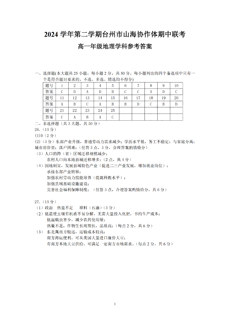 台州市山海协作体2024学年高一第二学期期中联考 地理答案.pdf