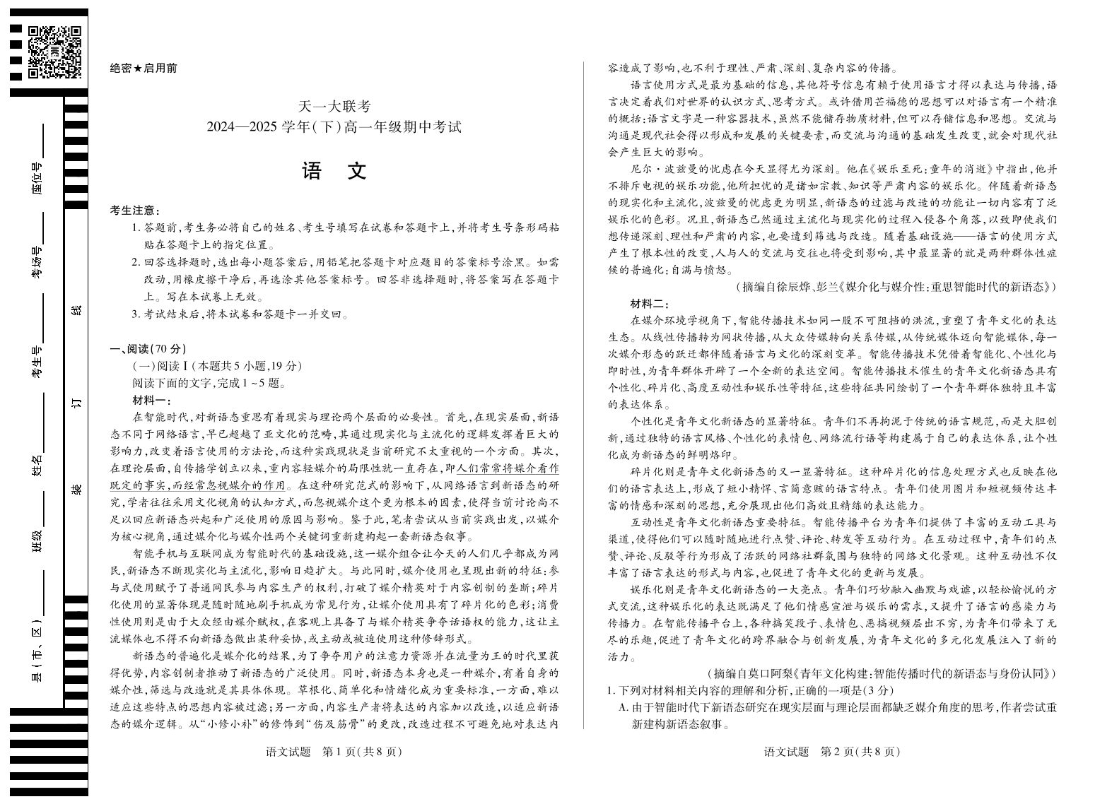 天一大联考·2024-2025学年(下)高一年级期中考试 语文.pdf