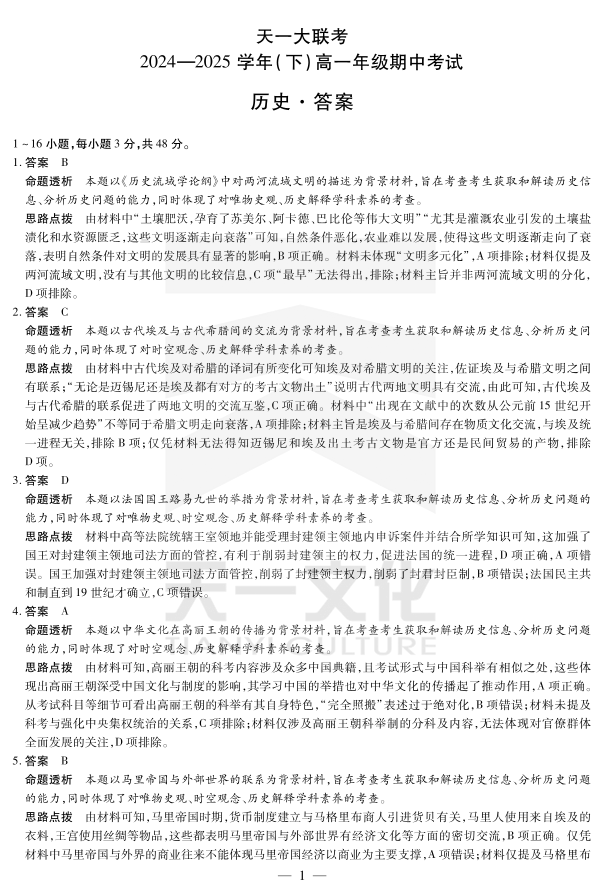 天一大联考·2024-2025学年(下)高一年级期中考试 历史答案.pdf