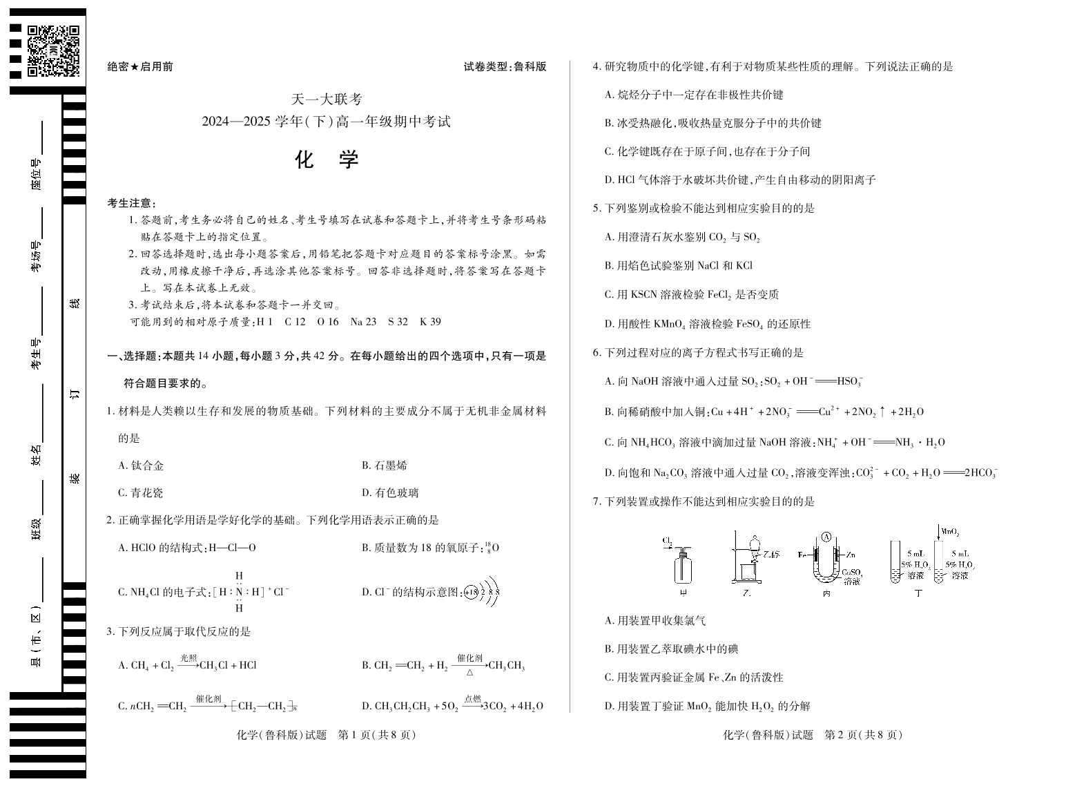 天一大联考·2024-2025学年(下)高一年级期中考试 化学(鲁科版).pdf