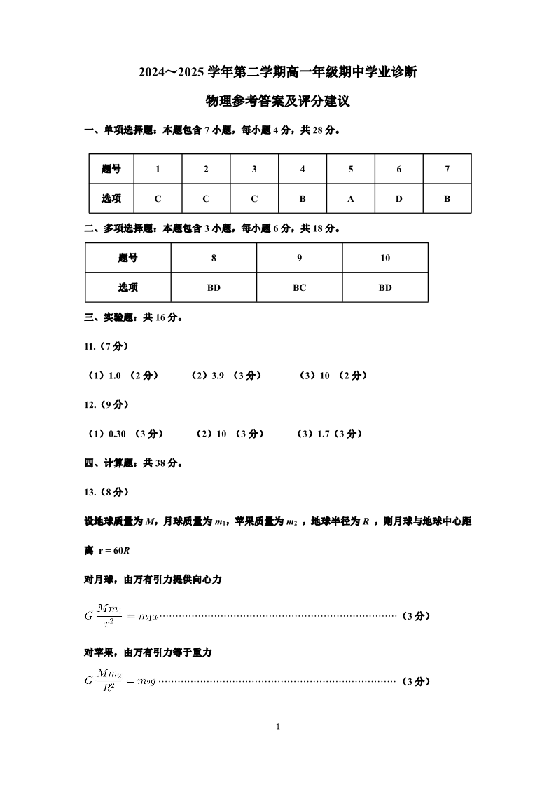太原市2024-2025学年第二学期高一年级期中学业诊断 物理答案.pdf