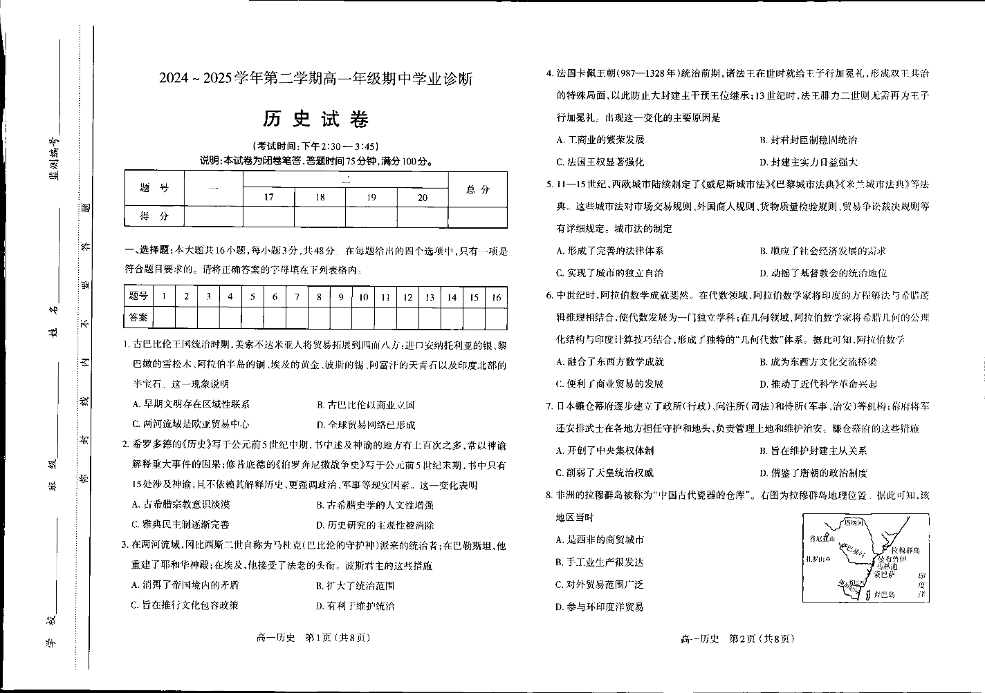 太原市2024-2025学年第二学期高一年级期中学业诊断 历史.pdf