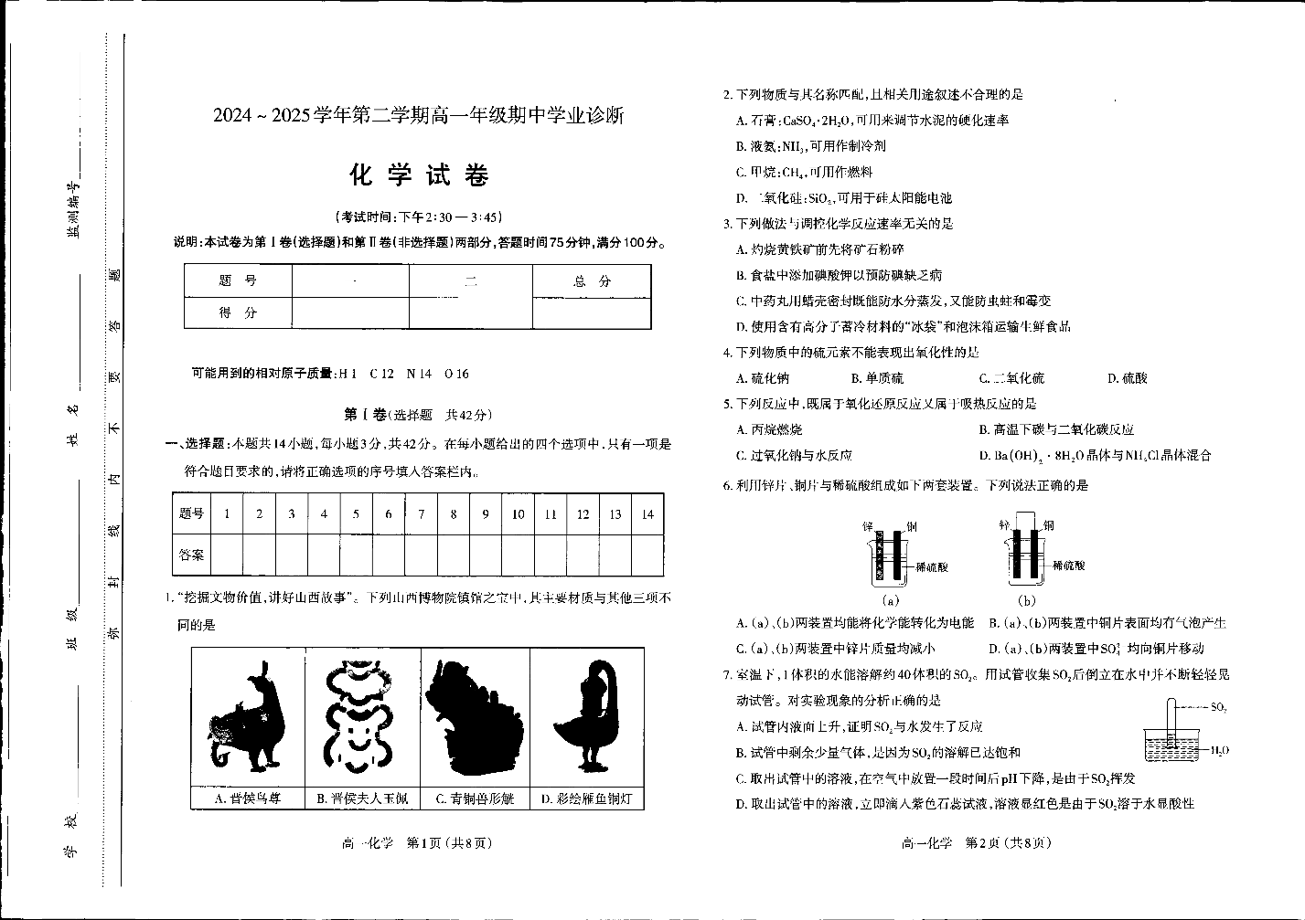 太原市2024-2025学年第二学期高一年级期中学业诊断 化学.pdf
